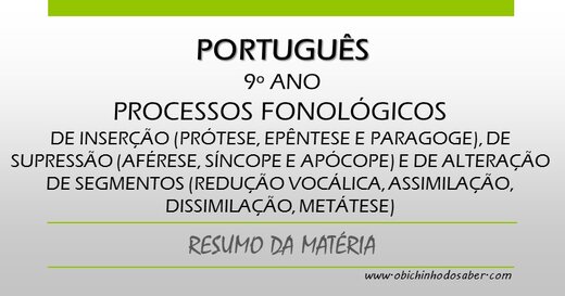 9º ANO / Português 9º / Resumos da matéria e exercícios 1 de Agosto de 2016 by Luis Carrilho · Published 1 de Agosto de 2016 Português 9º | Processos fonológicos de inserção (prótese, epêntese e paragoge), de supressão (aférese, síncope e apócope) e de alteração de segmentos (redução vocálica, assimilação, dissimilação, metátese)Resumo de Português | 9º ano | 2 de 11
